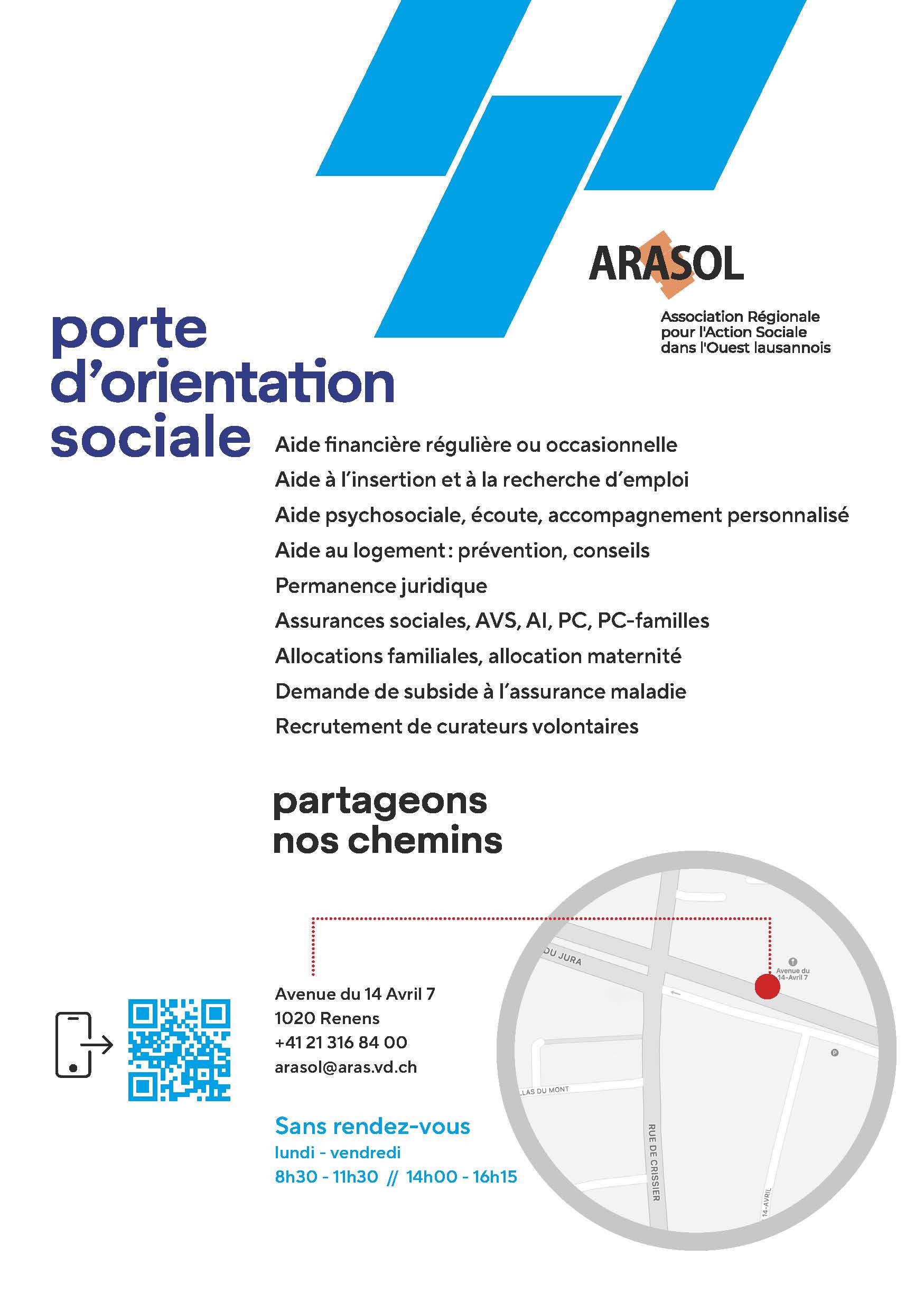 Vous présenter à la Porte d'Orientation Sociale (POS), av du 14 Avril 7 à Renens ou téléphoner au 021 316 84 00 ou écrire à arasol@aras.vd.ch.